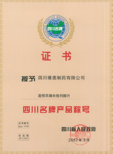 易明醫(yī)藥”奧恬蘋牌米格列醇片”,被四川省人民政府辦公廳川辦函(2017)16號授予“四川名牌產(chǎn)品”稱號
